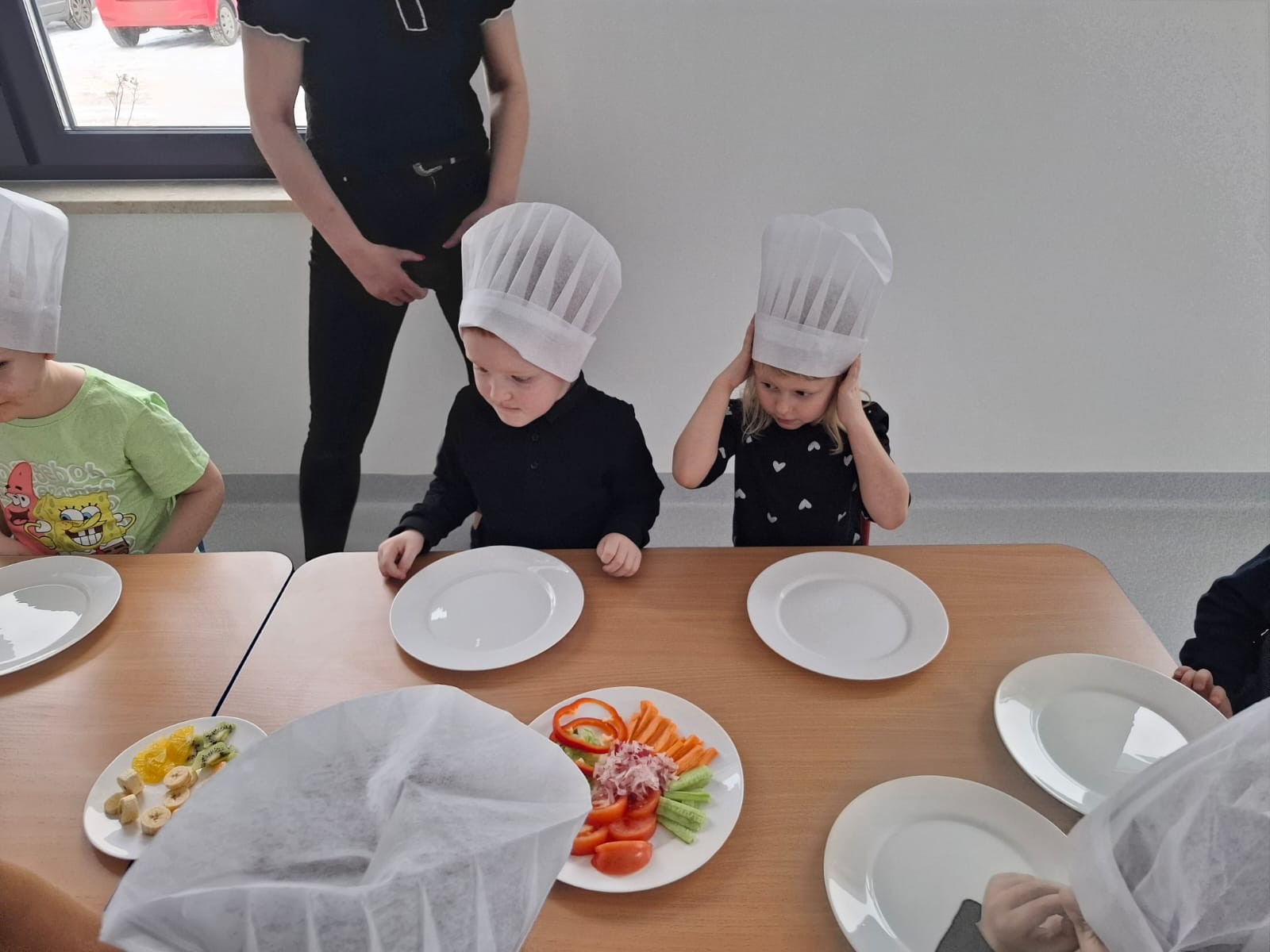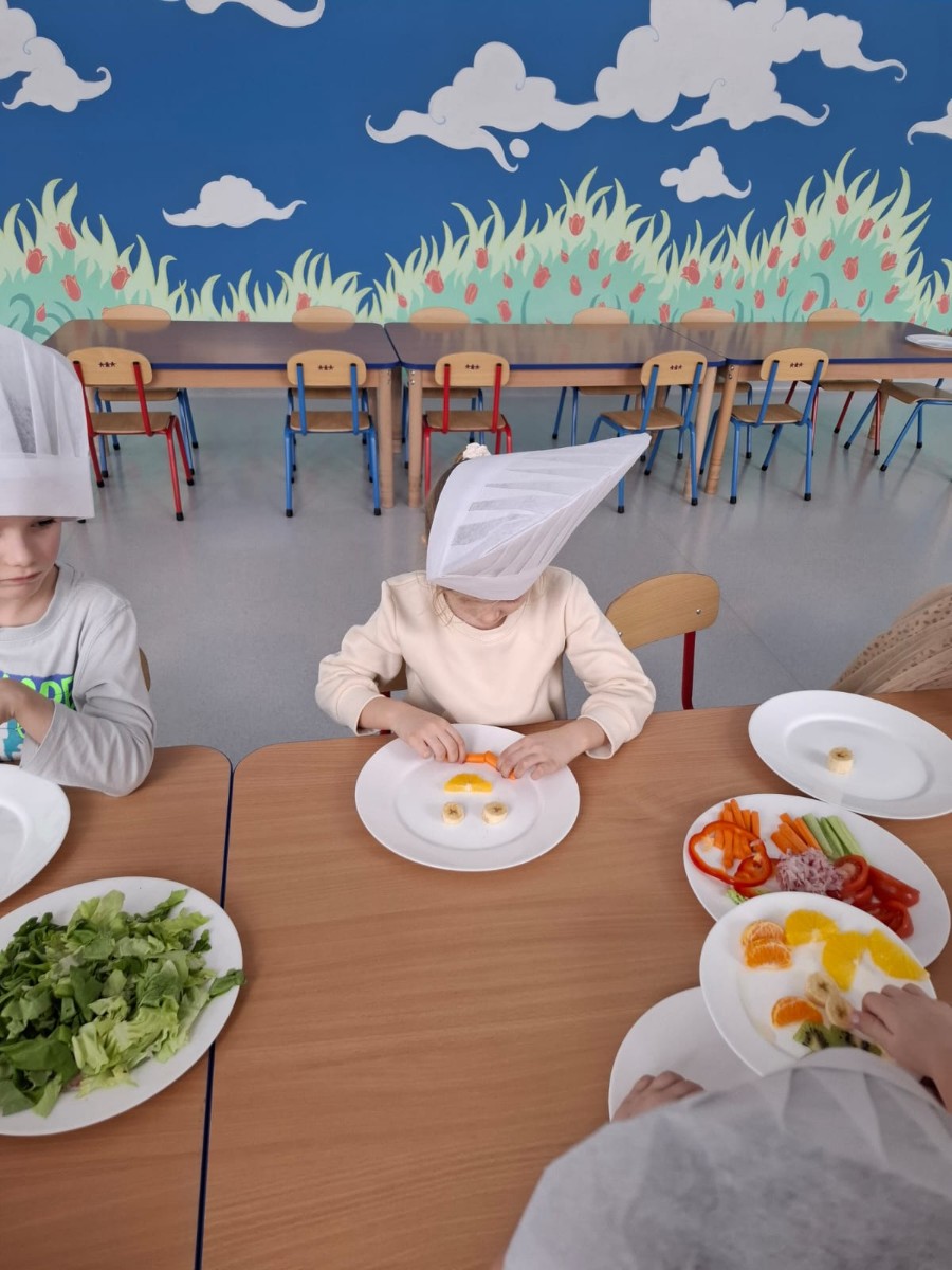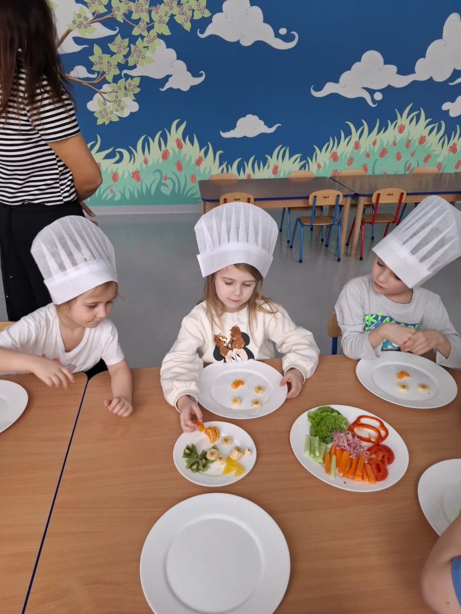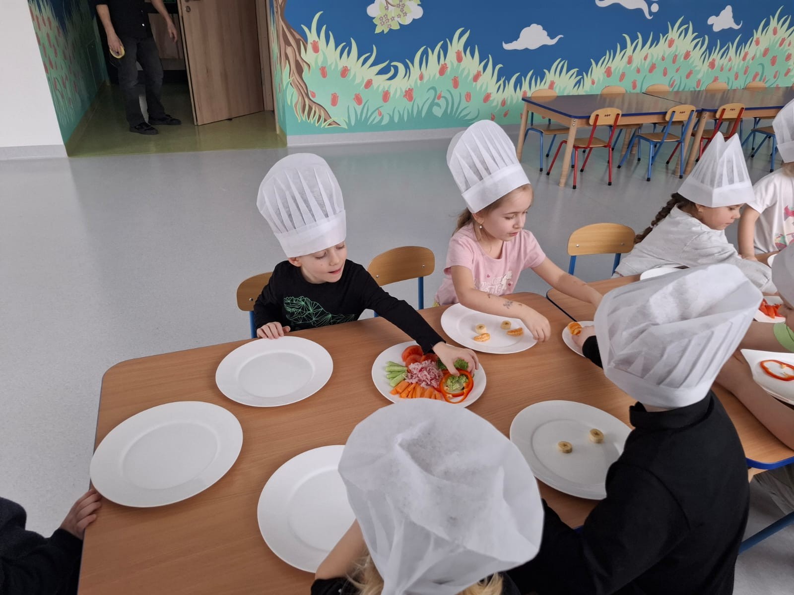 W naszym przedszkolu odbył się wyjątkowy Dzień Zdrowego Odżywiania. Dzieci dowiedziały się, jak ważną rolę w codziennym życiu odgrywa zdrowa i zbilansowana dieta. Nie zabrakło także licznych zabaw ruchowych, które pokazały, że aktywność fizyczna jest równie istotna dla zdrowia. Dużym zainteresowaniem cieszyła się zabawa sensoryczna, podczas której dzieci rozpoznawały warzywa i owoce ukryte w pudełku wyłącznie za pomocą zmysłu dotyku. Przedszkolaki miały również możliwość wcielenia się w małych kucharzy, zakładając czapki kucharskie. Zwieńczeniem dnia była degustacja „potworków” z warzyw i owoców, które dzieci własnoręcznie przygotowały na talerzach. Było to nie tylko smaczne, ale również bardzo kreatywne doświadczenie. Ten dzień dostarczył dzieciom wiele radości i cennych informacji na temat zdrowych nawyków żywieniowych.