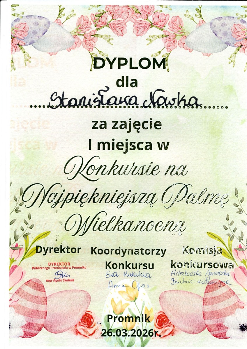 W konkursie na „Najpiękniejszą Palmę Wielkanocną” organizowanym przez Publiczne Przedszkole w Promniku udział wzieli nasze przedszkolaki: Nadia Gad, Stanisław Nowek oraz cała grupa "Biedronek". Rozstrzygnięcie odbyło się 26 marca 2026 roku gdzie nasze zdolne dzieci zdobyły: